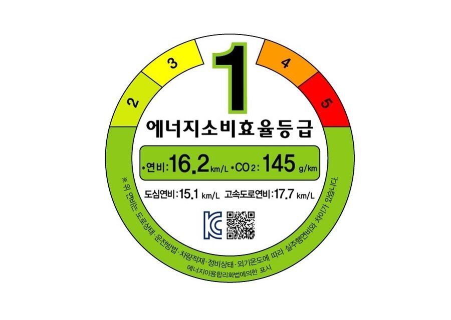 ① 도심연비(도심주행 에너지소비효율) - 도심주행 모드(FTP-75)로 측정한 에너지소비효율을 5-cycle 보정식에 적용하여 산출된 도심연비입니다. ② 고속도로연비(고속도로주행 에너지소비효율) -