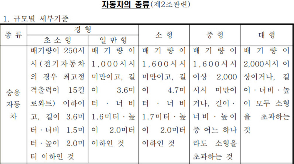 - 초소형: 배기량 250cc 이하이고, 길이 3.6m, 너비 1.5m 높이 2.0m 이하인 것